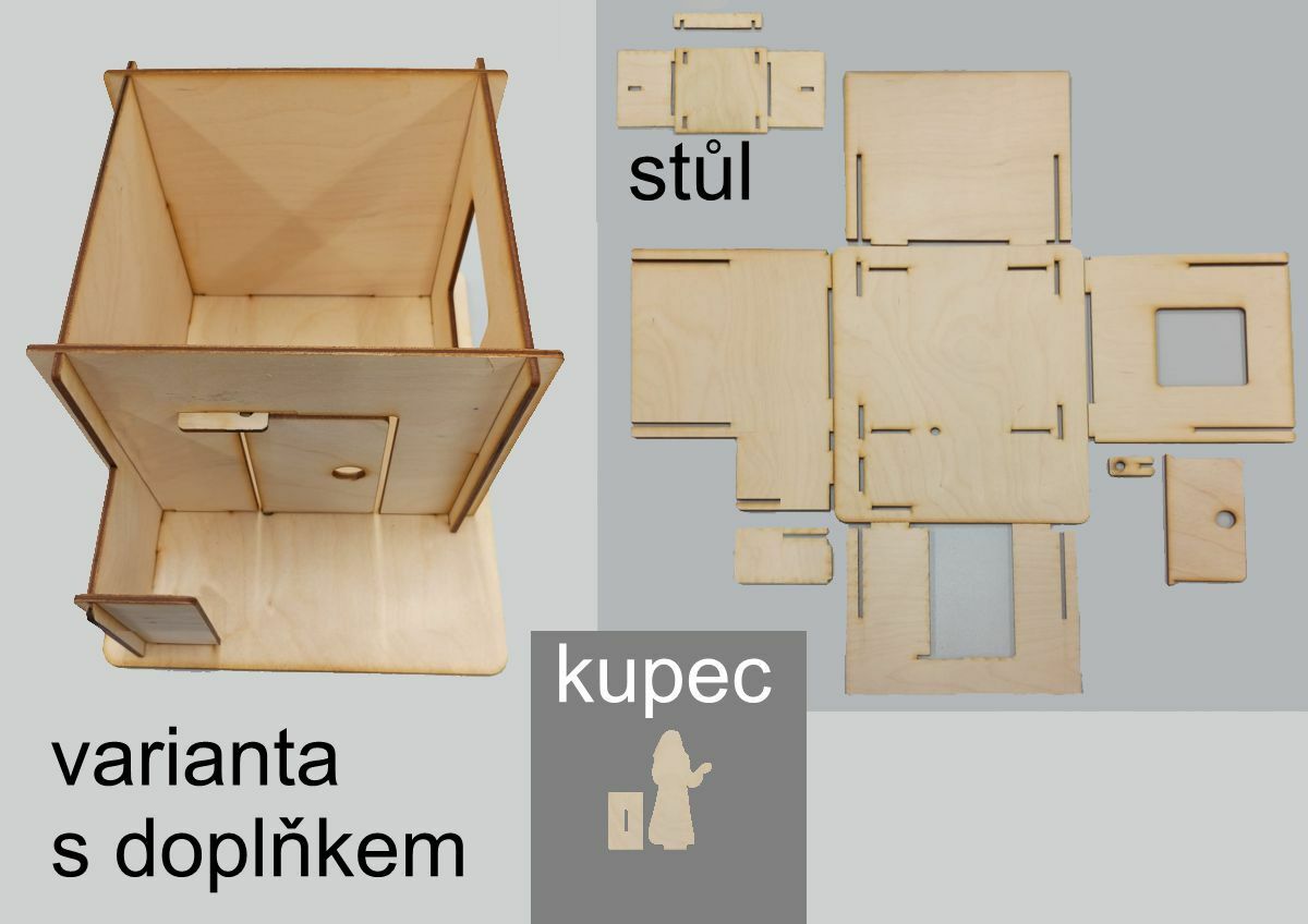 Základní sada obsahuje 8 dílů z překližky k sestavení dioramatu a figurku kupce. Volitelný doplněk této sady je stůl. Stůl lze nahradit krabičkou, proto jsme jeho objednání nastavili jako volitelné.