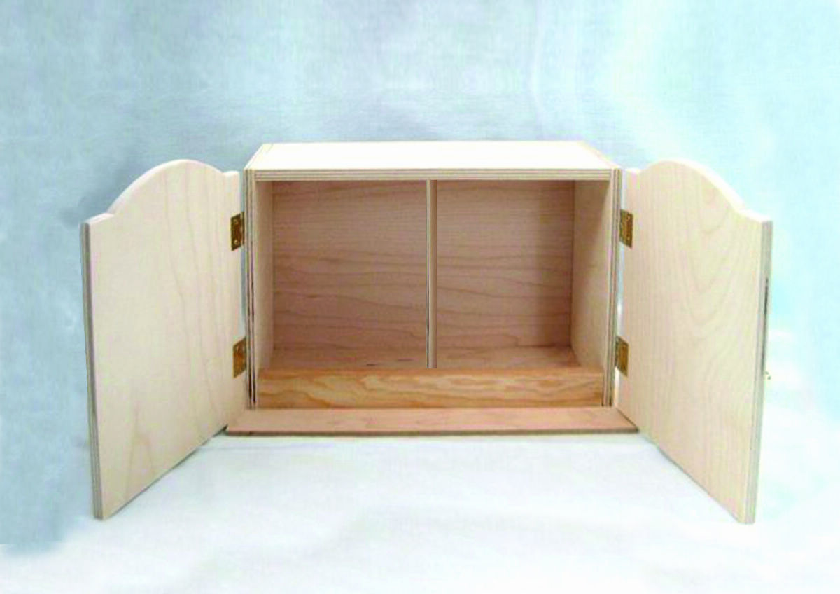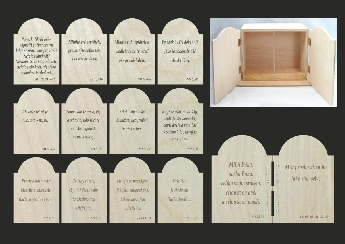 Tuto sadu vyřezanou z topolové překližky dodáváme sestavenou nebo rozloženou. Rozloženou sadu (skříňku) je třeba slepit a panty přinýtovat. Panty (6 ks) jsou součástí sady.