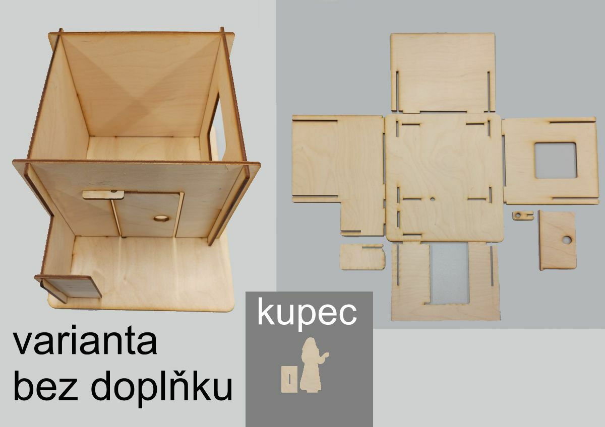 Základní sada obsahuje 8 dílů z překližky k sestavení dioramatu a figurku kupce. Volitelný doplněk této sady je stůl. Stůl lze nahradit krabičkou, proto jsme jeho objednání nastavili jako volitelné.