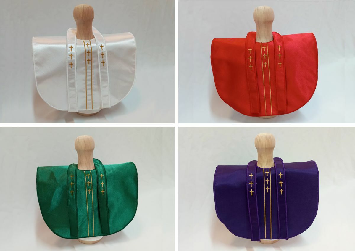 Sada čtyř ornátů v liturgických barvách pro dřevěnou figurku kněze vysokou 30 cm.