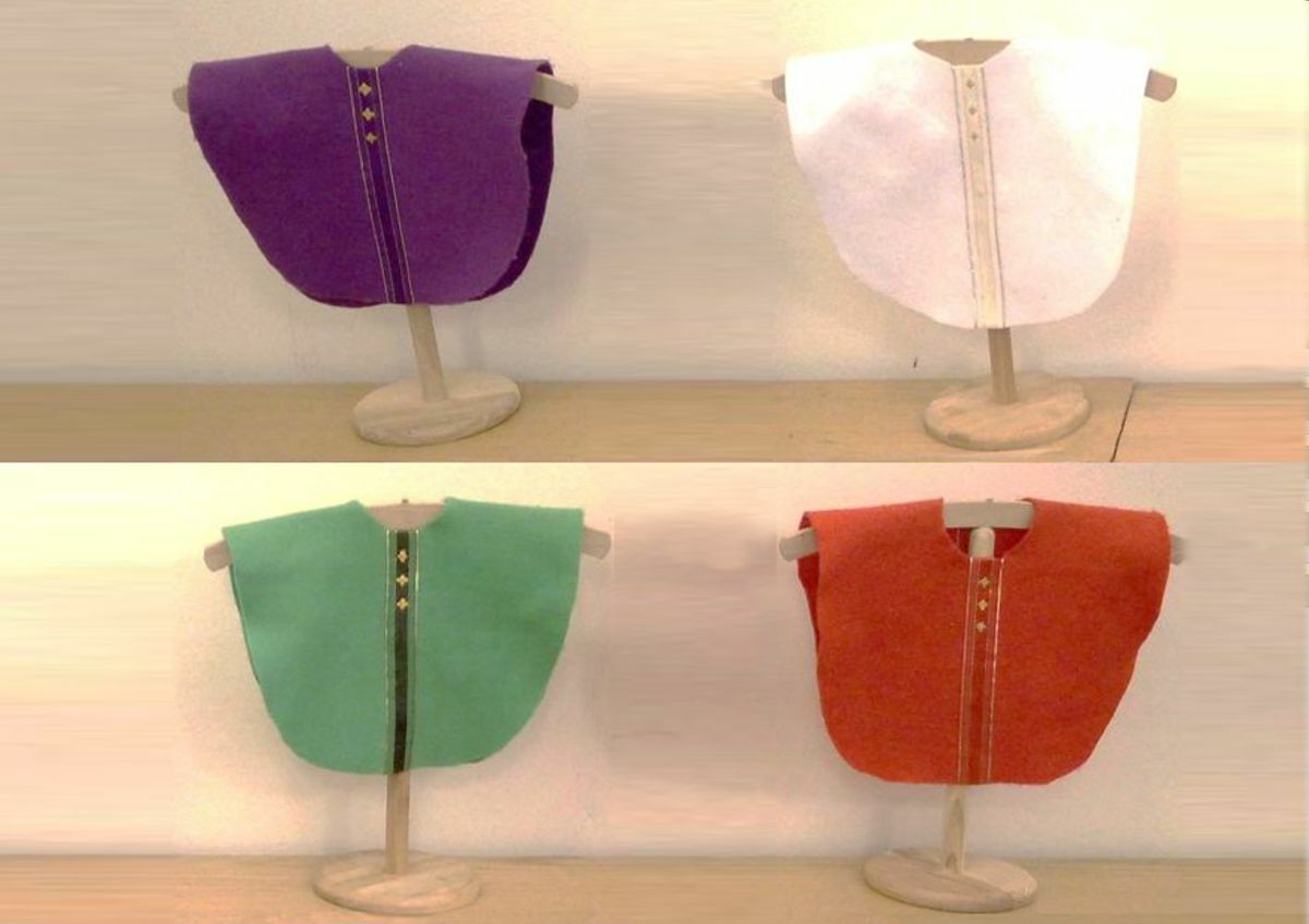 sada čtyř ornátů v liturgických barvách pro dřevěnou figurku kněze vysokou 30 cm.