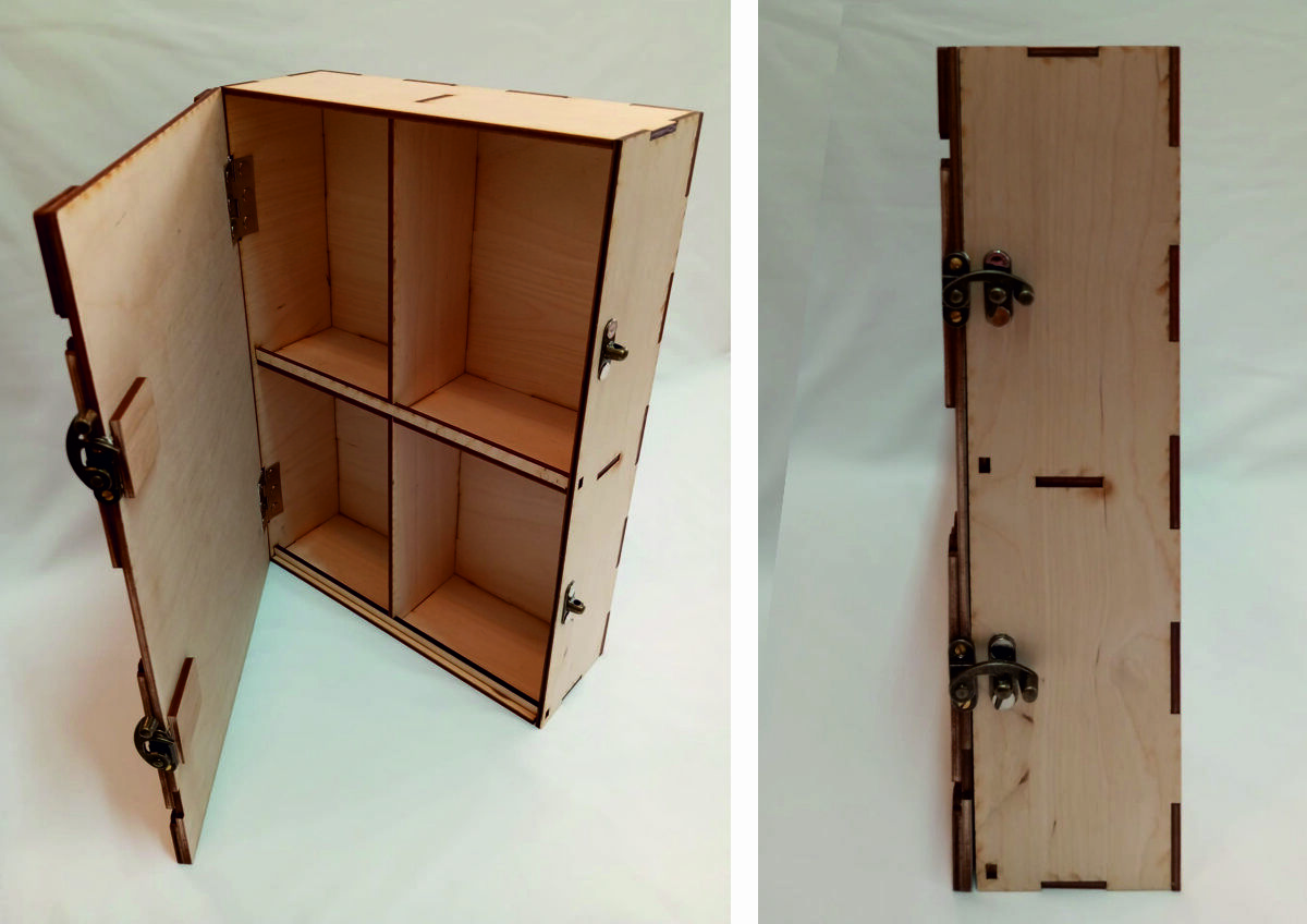 Skříňka z překližky se čtyřmi oddíly, každý na velikost sešitku do velikosti A6 (105 mm x 148 mm)