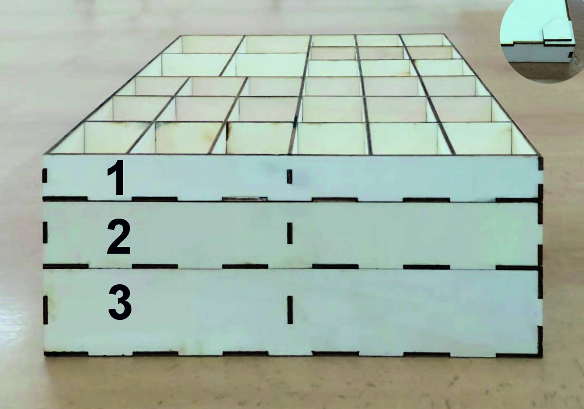 Tři tácy s vnitřním členěním, každý je jinak vysoký (vnitřní výška táců je 3 cm, 4,8 cm, 6 cm).