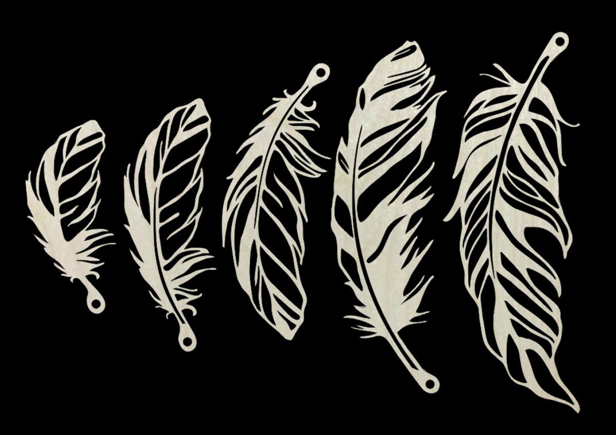 Sada pěti peříček ve velikostech od 7 do 13 cm. , dírka na zavěšení má průměr 2,5 mm