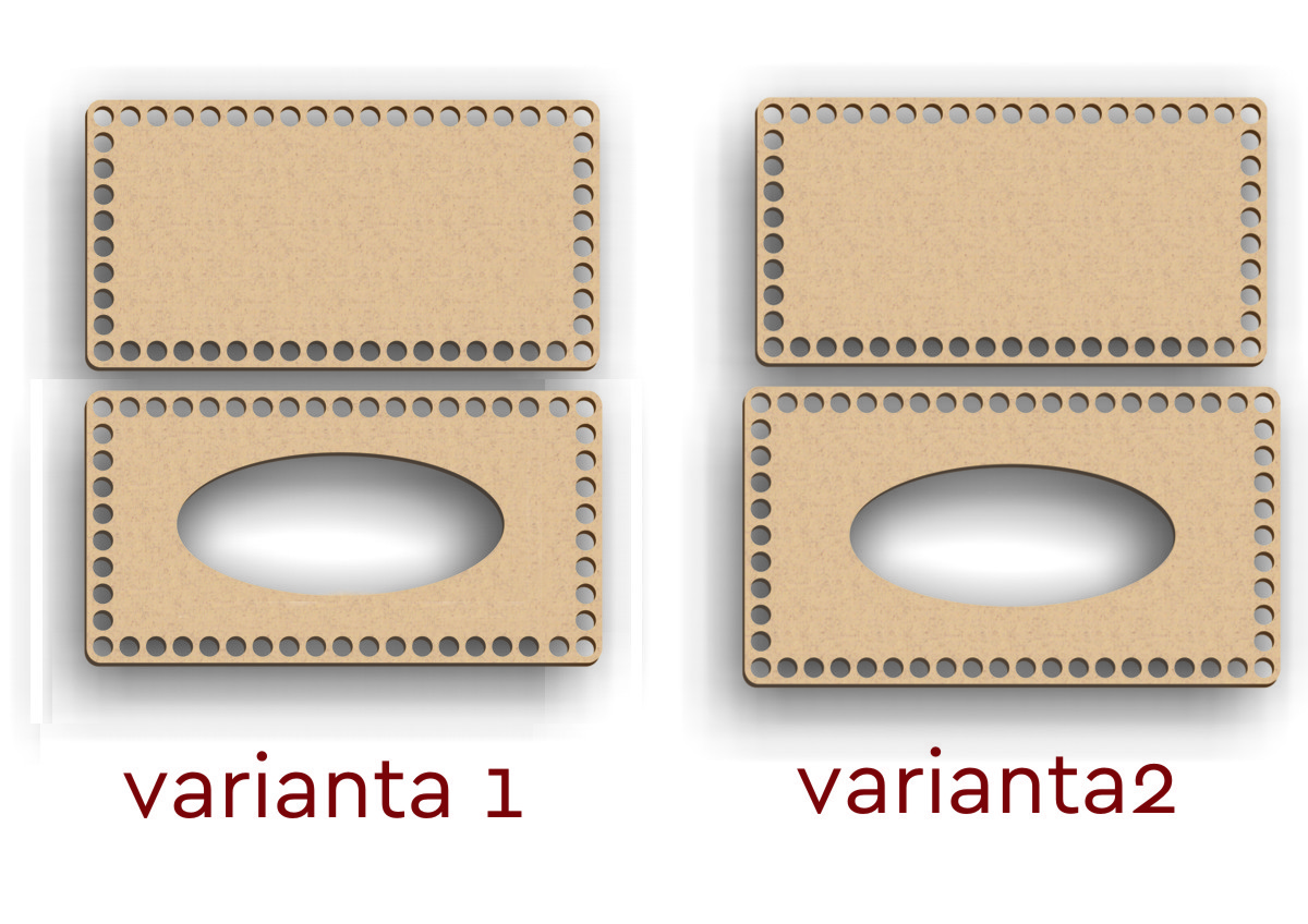 Sada - Dno a víko na háčkovanou krabičku na papírové kapesníky. Vyřezáno laserem z překližky (tloušťka materiálu je 3-4 mm), průměr dírky je 10 mm. Mezery mezi dírkami jsou 3 mm, takže středová vzdálenost dírek je 13 mm.