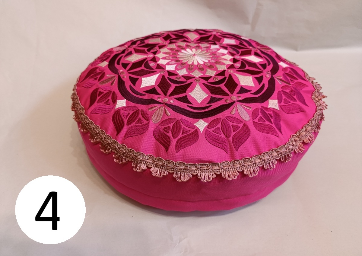 Polštářky pro ideální sezení na zemi (uvnitř i venku), ovšem všechny zazáří i v interiéru. Jsou ušity z velmi pevné polyesterové látky, která má z rubové části zátěr proti vlhkosti a chladu od země. Je třeba chránit před deštěm, horní strana polštářů je prodyšná - barva mechová; pistáciová; skořicová; fialová; světle fialová (lila); černá.